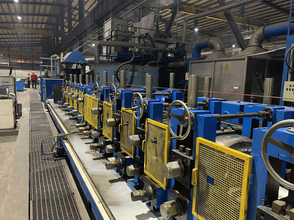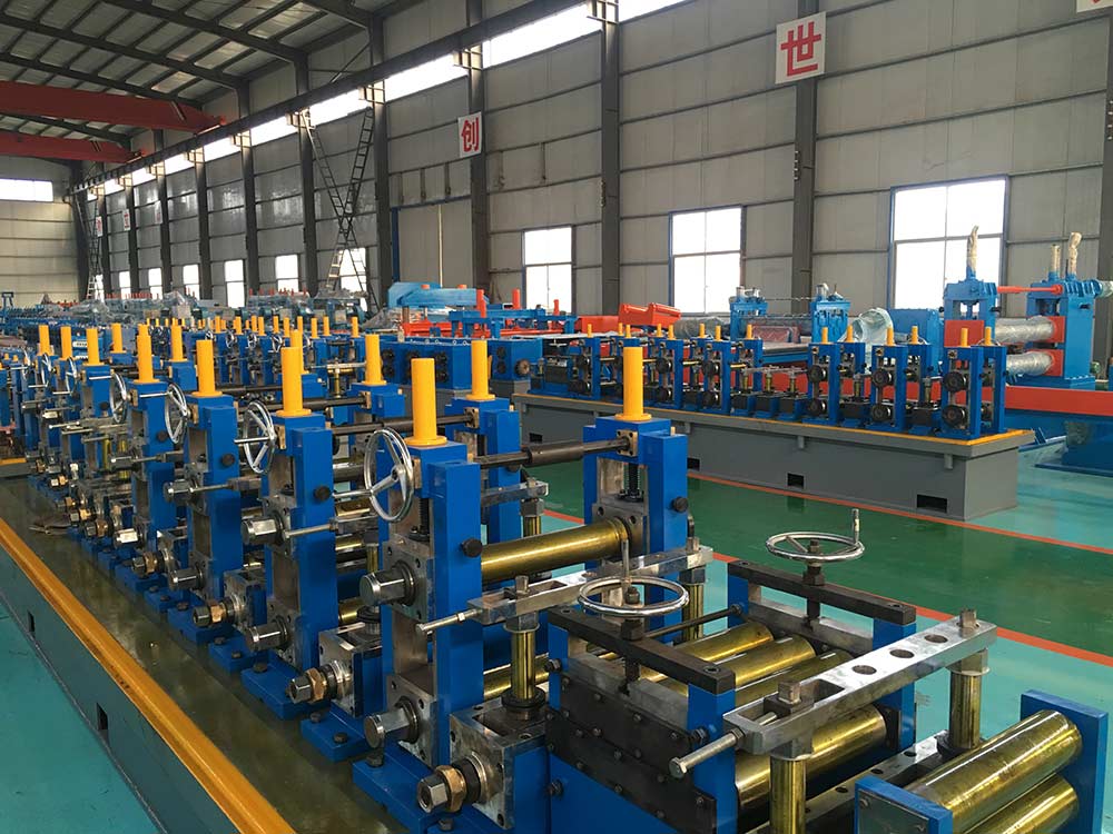 Spiral Accumulator→→Forming section (Flattening unit +Main driving unit +Forming unit +Guide unit +High frequency induction welding unit +squeeze roller) + De-burr frame→→Cooling unit →→ Sizing section →→Flying saw→→Rollout conveyor→→ Straightening Machine→→pipe end facing & chamfering→→Hydro Tester →→Packing box