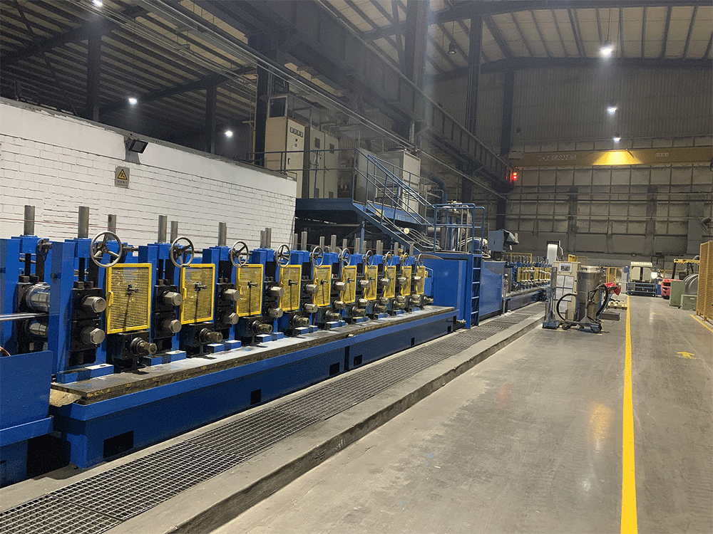 The mill is intended for manufacturing of round pipe of Φ50mm-Φ114mm with thickness of 2.0mm–5.0mm from cold-rolled and hot-rolled coil strip by means of unclosed tubular blank with its subsequent welding into tube, edge heating by means of solid state high-frequency welder, longitudinal seam welding in rolls of tube welding machine, cooling, further sizing or shaping and on-stream cutting of endless tube in measured lengths.