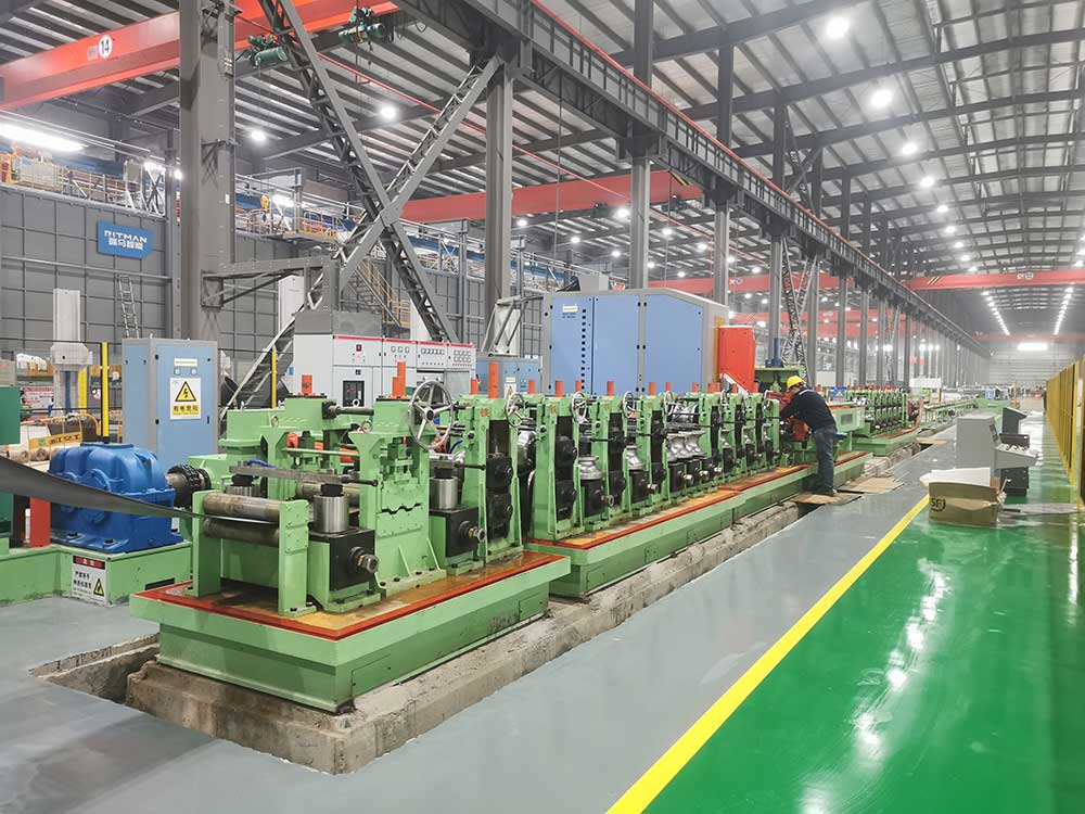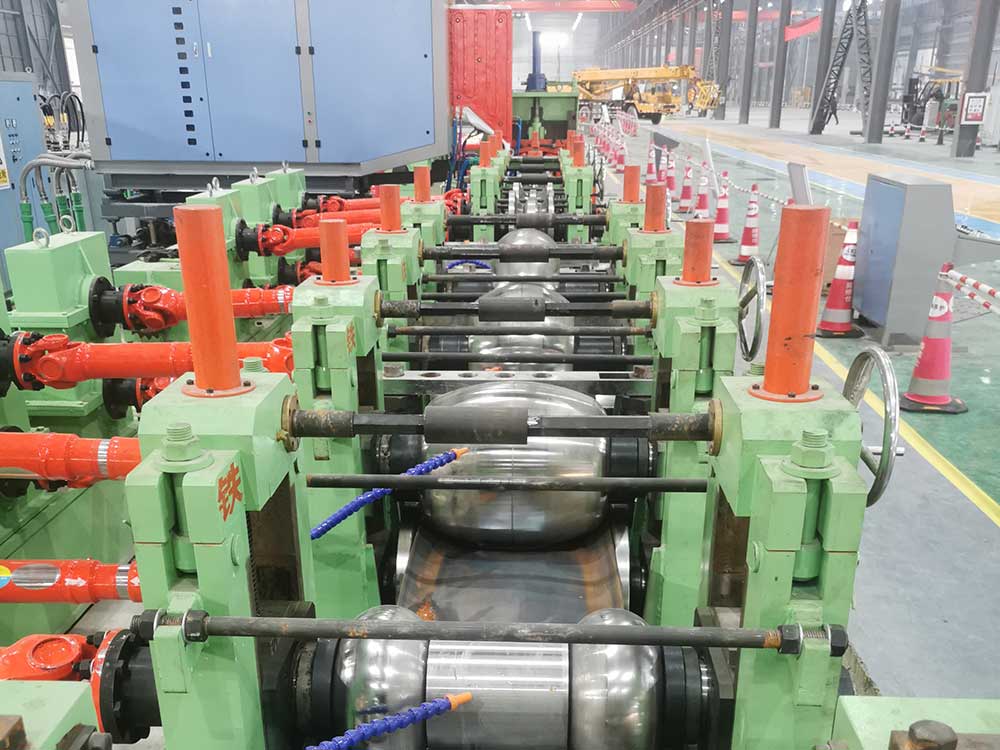The mill is intended for manufacturing of round pipe of Φ76mm-Φ168mm with thickness of 2.0mm–6.0mm from cold-rolled and hot-rolled coil strip by means of unclosed tubular blank with its subsequent welding into tube, edge heating by means of solid state high-frequency welder, longitudinal seam welding in rolls of tube welding machine, cooling, further sizing or shaping and on-stream cutting of endless tube in measured lengths.