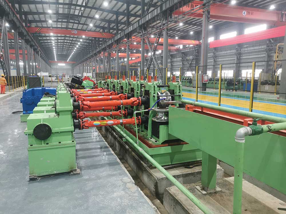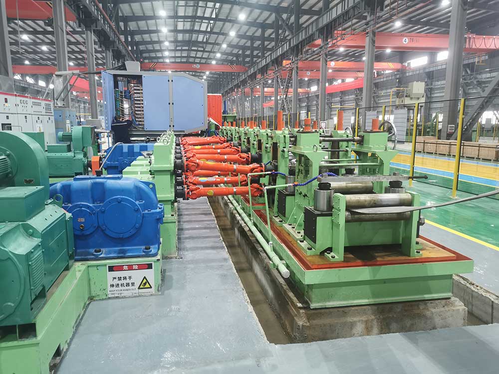 Spiral Accumulator→→Forming section (Flattening unit +Main driving unit +Forming unit +Guide unit +High frequency induction welding unit +squeeze roller) + De-burr frame→→Cooling unit →→ Sizing unit and straightener →→Flying saw→→Rollout conveyor